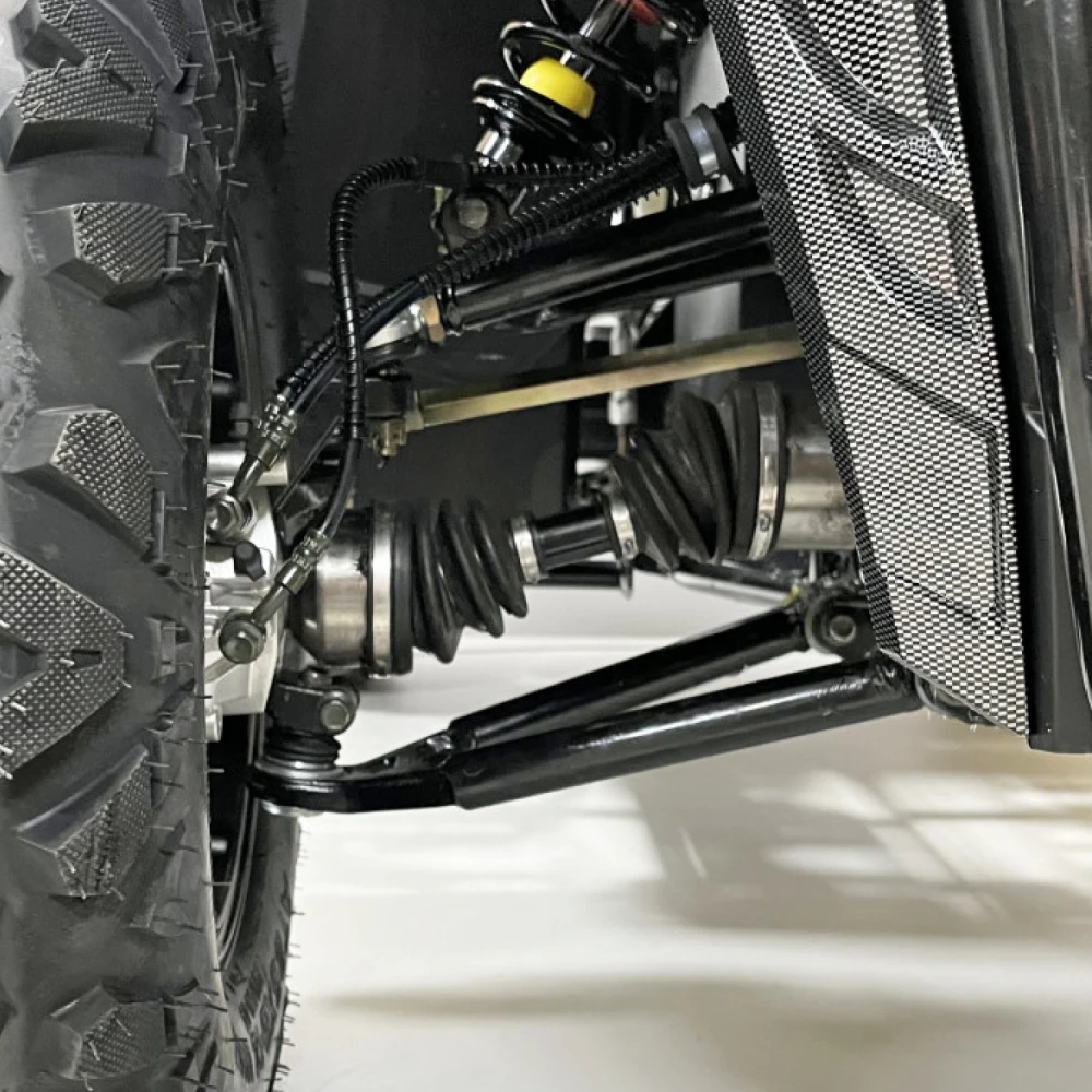 Шасси квадроцикла оснащено дифференциальной передачей, а регулируемые амортизаторы способствуют максимальному комфорту и безопасности при движении по неровной поверхности. Колесные диски из алюминия (R12) в сочетании с высококачественными шинами (25X8-12 спереди и 25X10-12 сзади) гарантируют отличное сцепление с дорогой, а передние и задние гидравлические дисковые тормоза обеспечивают мгновенную и надёжную реакцию при необходимости остановки. Оптимальная высота сиденья в 78 см способствует удобству управления и адаптации под большинство пользователей.