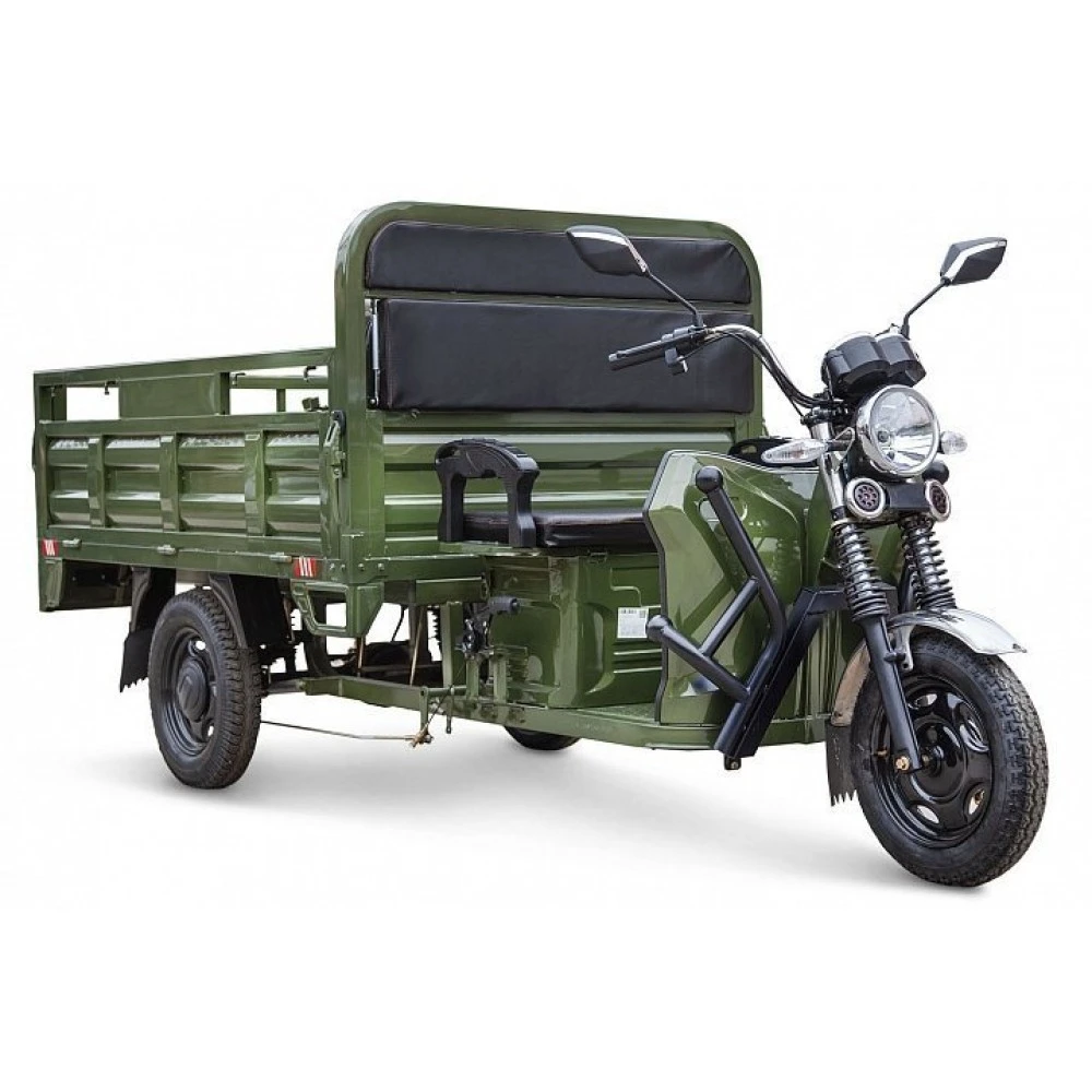 Вместительный кузов представлен размерами 1800 x 1250 x 475 мм (Д х Ш х В), имеет откидные борты, благодаря которым техника может использоваться на стройке и в сельском хозяйстве. Электротрицикл показывает высокую эффективность при выполнении погрузочно-разгрузочных работ.