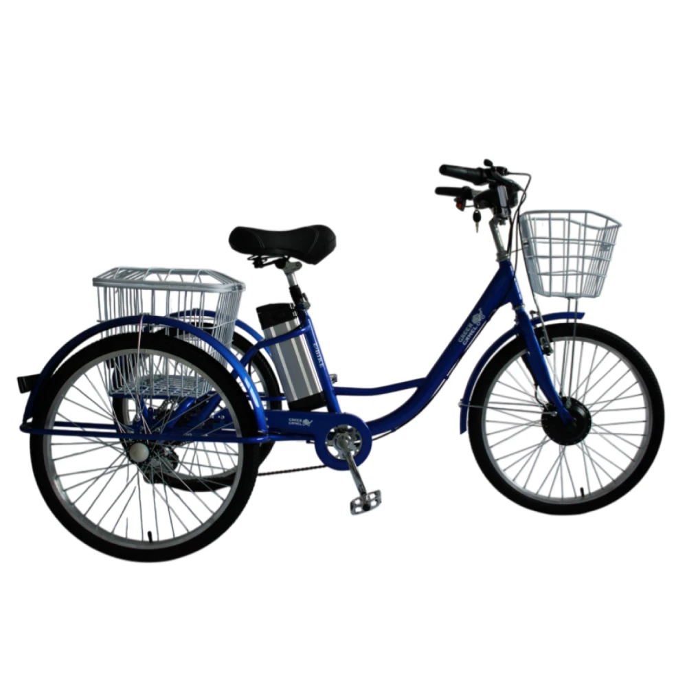 GreenCamel Трайк-24 V3 — трёхколёсный электровелосипед-трицикл для стабильных городских поездок, доставки или отдыха. Низкий центр тяжести обеспечивает устойчивость, максимальная скорость 25 км/ч, нагрузка 150 кг, пробег до 40 км. Идеален для тех, кто ценит безопасность и простоту.