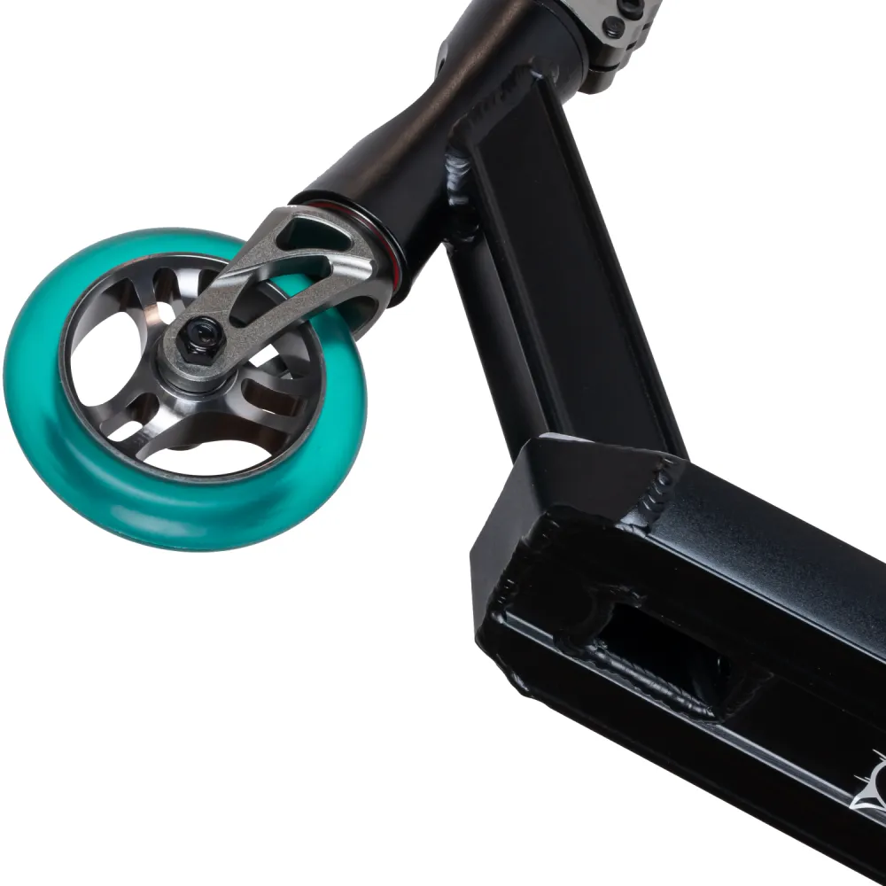 110-мм колесная часть изготовлена из долговечного, мало стираемого полиуретана. Наличие алюминиевой фрезерованной вилки и фирменного заднего тормоза райдер может рассчитывать на качественный безопасный отскок.